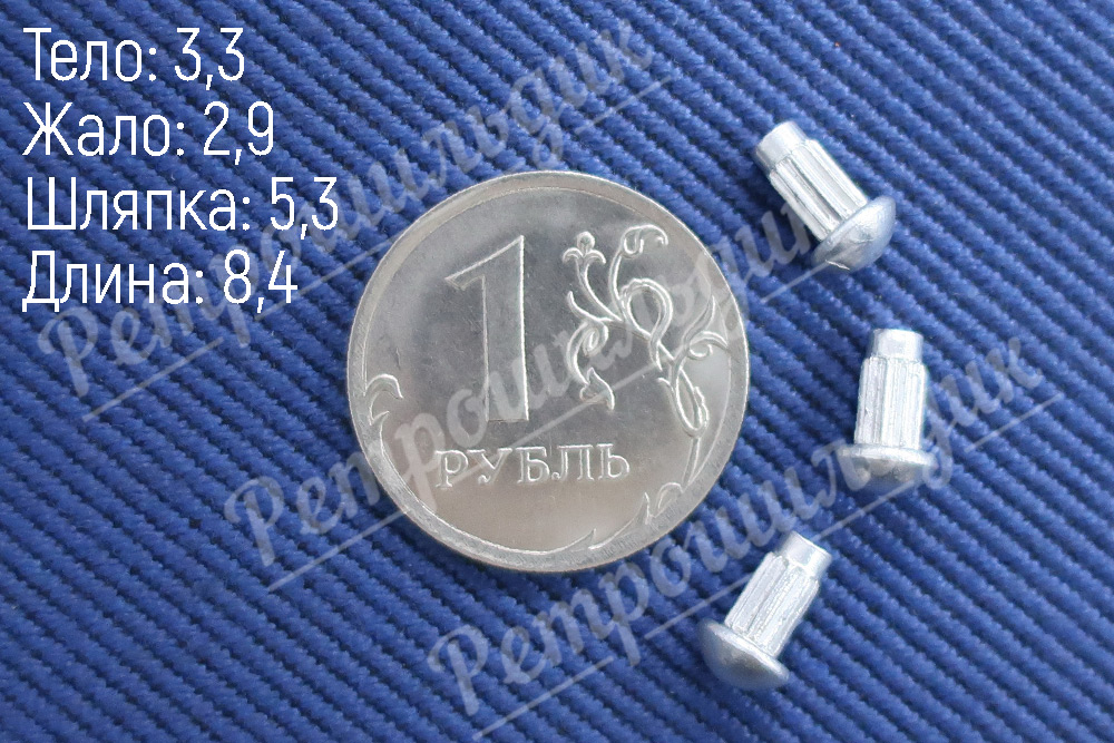 Стоимость за 1 шт. Жало: 2,9 мм, тело: 3,3 мм, шляпка: 5,3 мм, длина: 8,4 мм