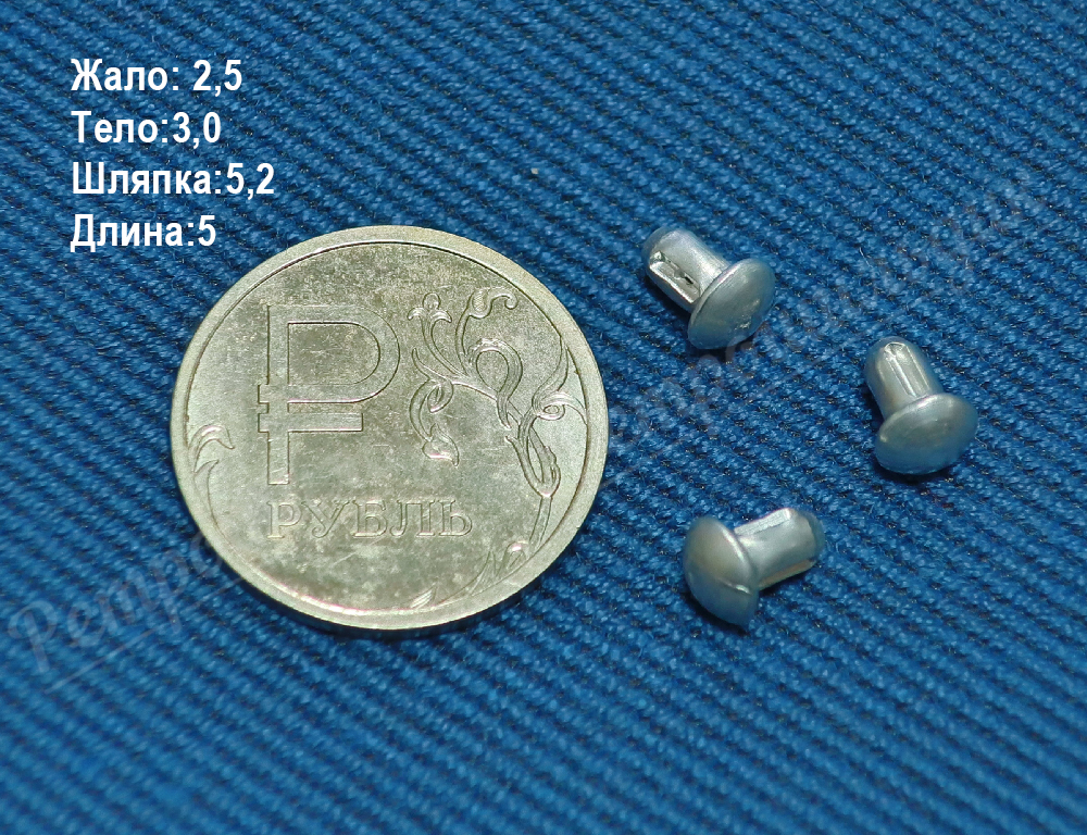Стоимость за 1 шт. Жало: 2,5 мм, тело: 3,0 мм, шляпка: 5,2 мм, длина: 5 мм